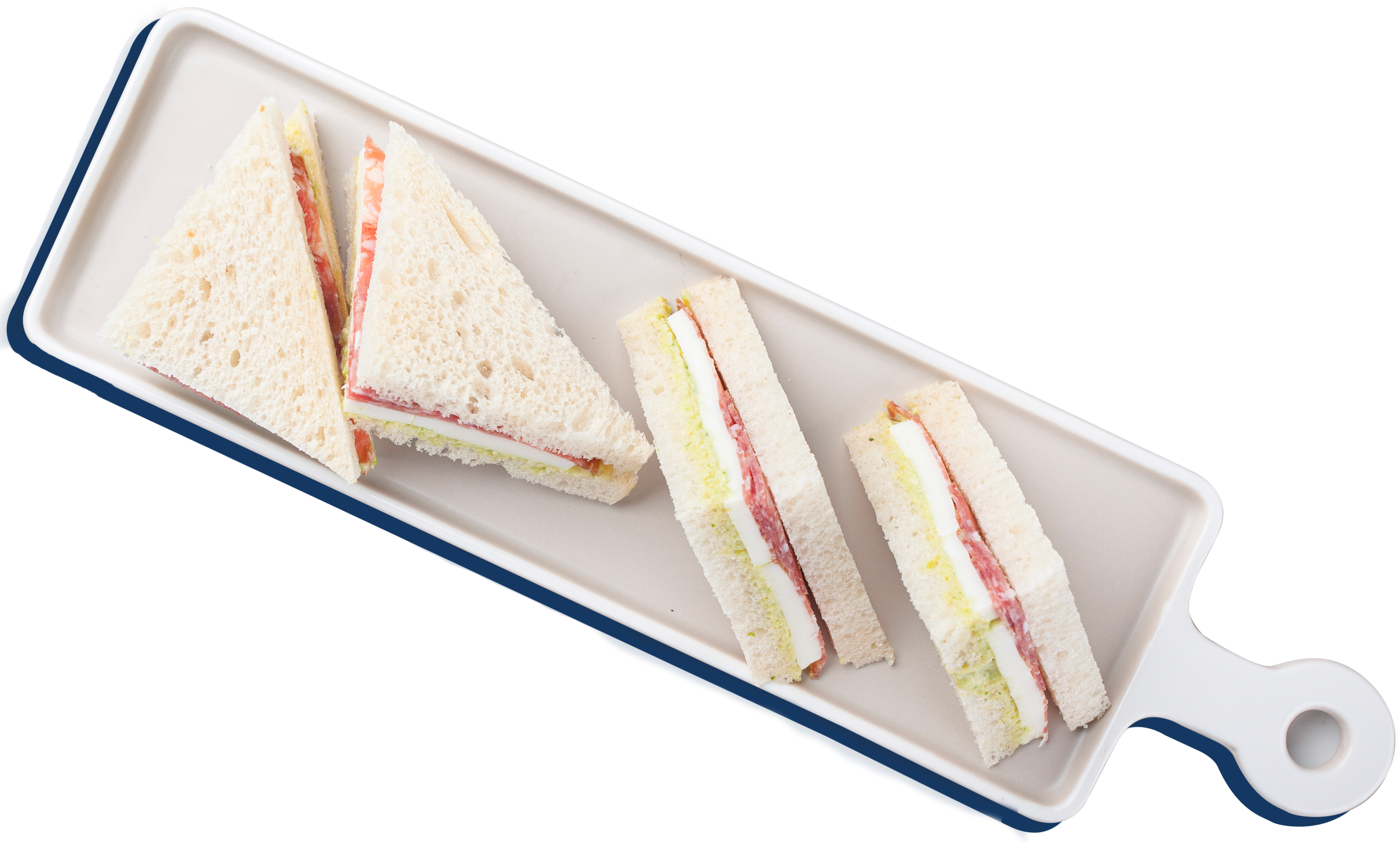 Remove the crusts and cut each sandwich into 4 triangles.