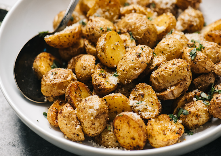 Spread the vegetables onto a baking sheet lined with parchment paper (this helps absorb moisture from the zucchini). Roast for 25–30 minutes, until the potatoes are golden and crisp. You can sprinkle Parmesan directly onto the vegetables before baking if you want an extra cheesy result