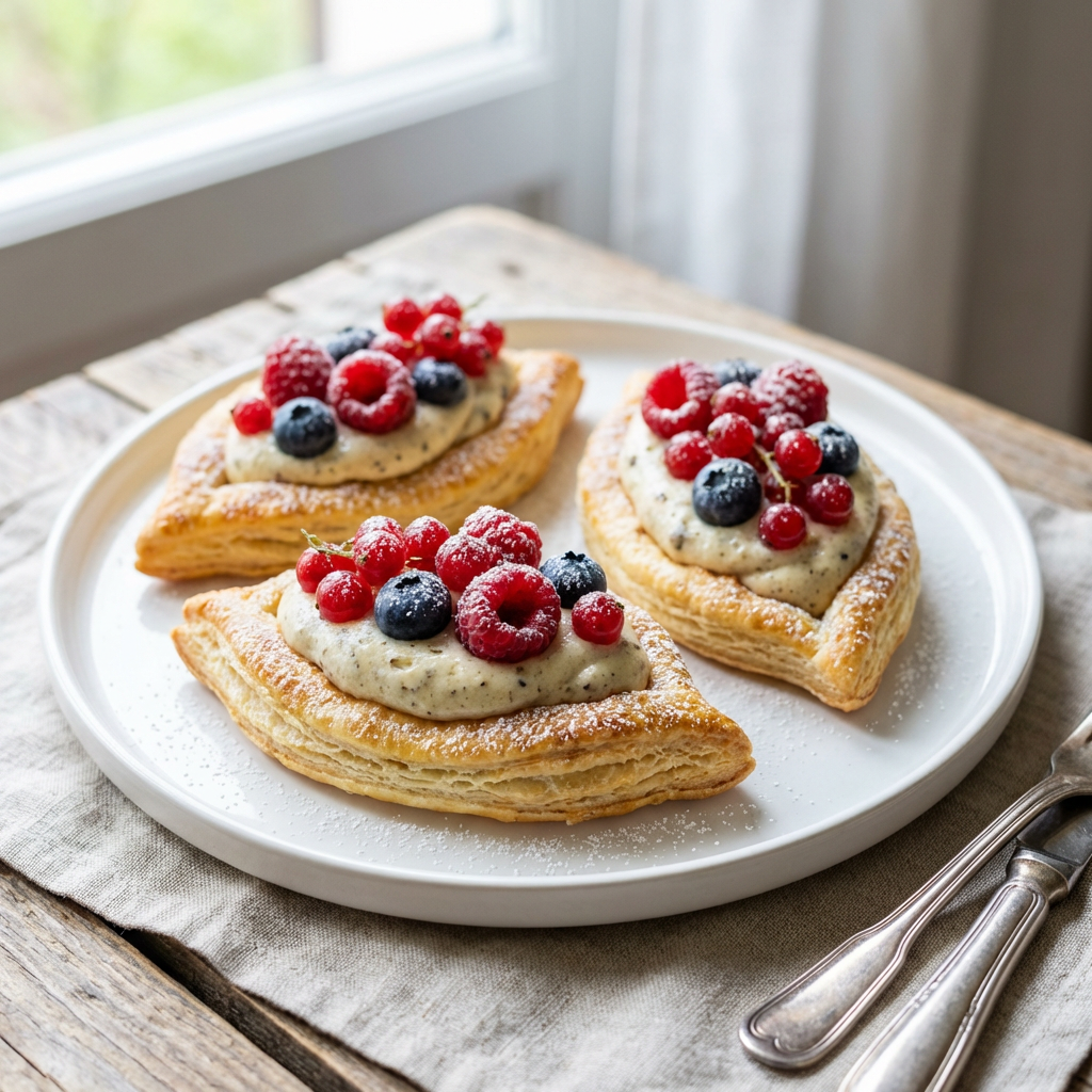 Puff pastry boats with cardamom buttercream & berries